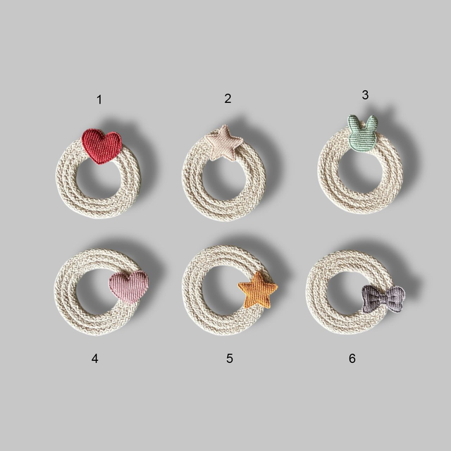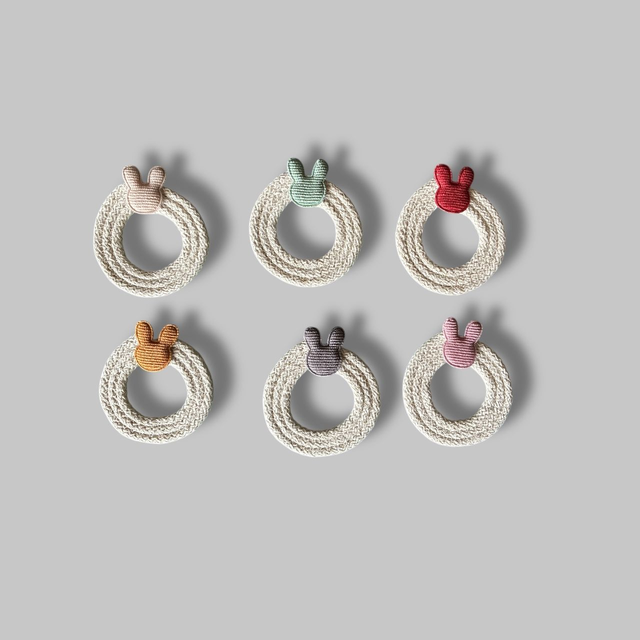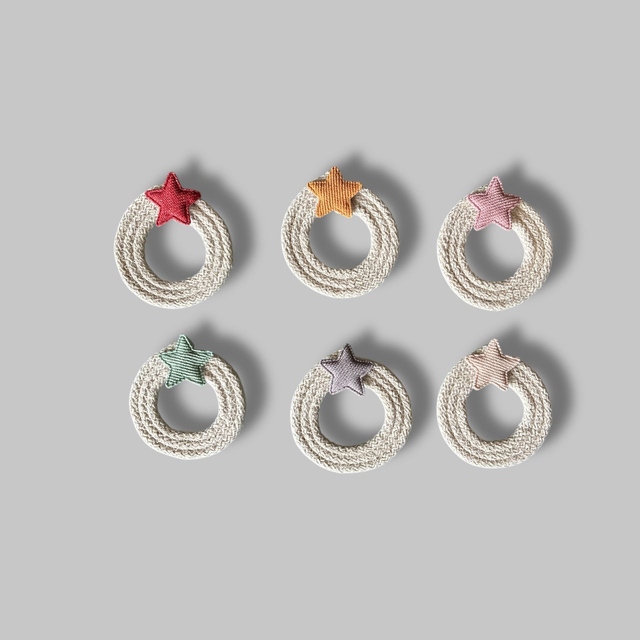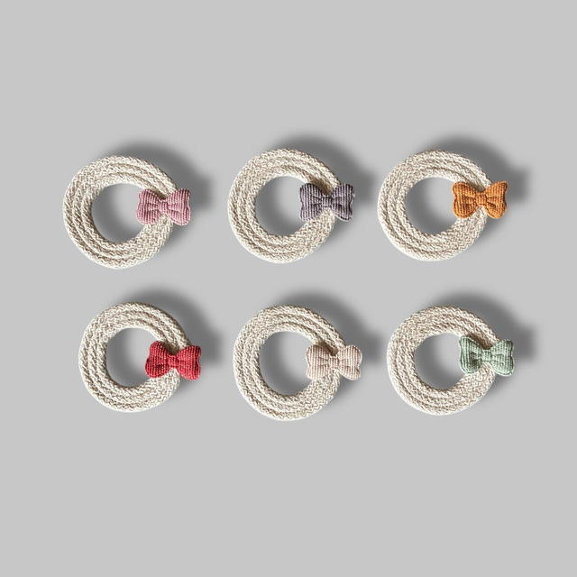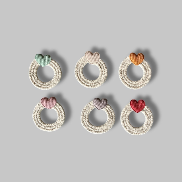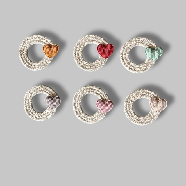 Assortiment de 6 ronds de serviette réalisés en corde de coton beige tressée avec un patch. Cadeau de pendaison de crémaillère, de remerciement. Art de la table made in Boulogne Billancourt.