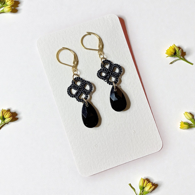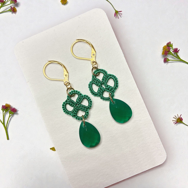 Boucles d'oreilles réalisées en dentelle de frivolité et montées avec des apprêts en acier inoxydable et des perles en cristal assorties.