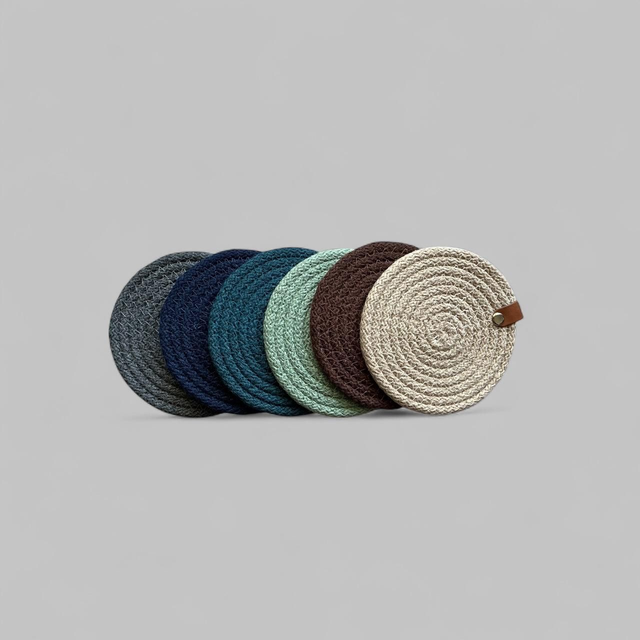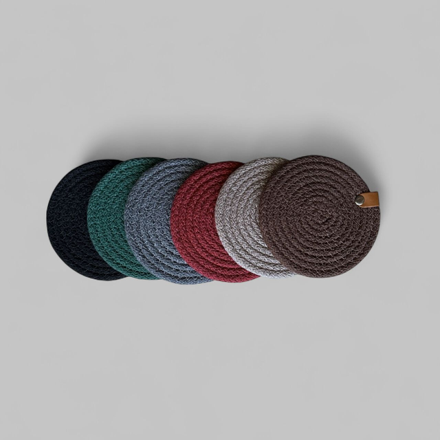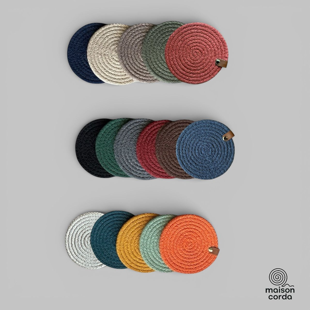 Ce dessous de verre est réalisé en corde de coton, cousue en spirale.