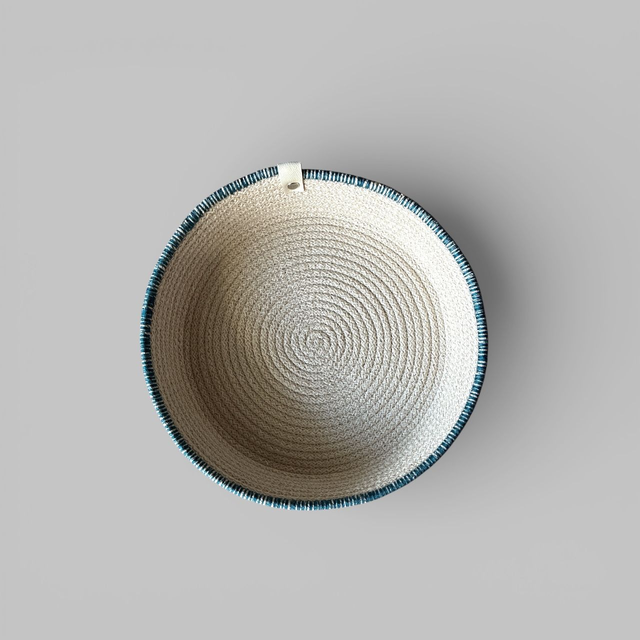Panier vide poche rond blanc, réalisé en corde de coton, cousue en spirale avec une bordure striée colorée, réalisé au point zigzag.