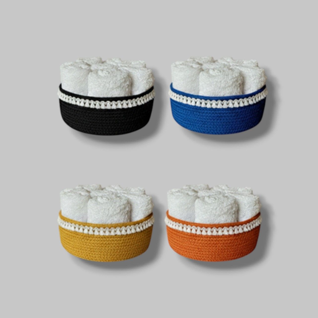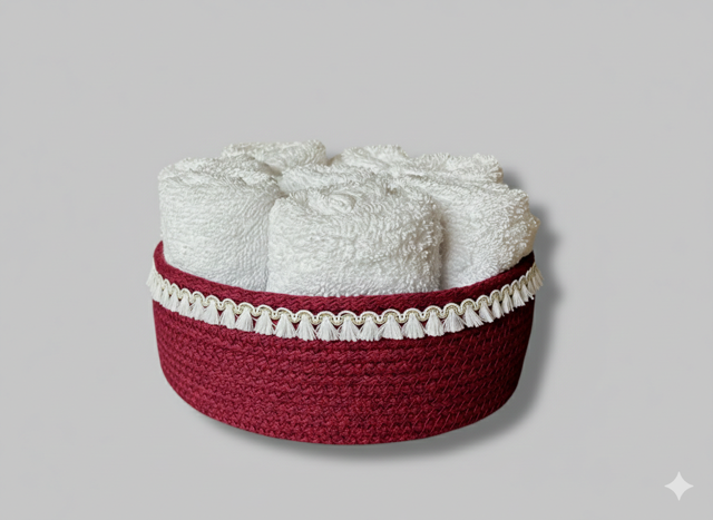 Panier rond, réalisé en corde de coton, cousue en spirale. Ce panier est rigide, tout en gardant la souplesse de la corde. Il est bicolor, avec un galon à franges blanc et doré. Il est assorti de 8 serviettes blanches qui peuvent être utilisées comme serviettes invités pour se sécher les mains et/ou comme débarbouillettes.